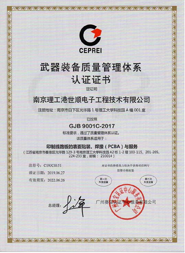 我公司一直注重質(zhì)量的管控,并且多年來一直按照GJB9001體系的要求來執(zhí)行,于2019年6月份取得由廣州賽寶認證中心認證的武器裝備質(zhì)量管理體系(GJB9001C-2017),我公司的質(zhì)量體系又上一臺階,歡迎有需